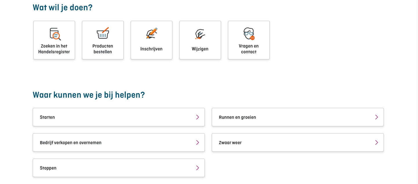 Neem als voorbeeld van een goede gebruikerservaring de website van de Kamer van Koophandel. Die website bezoek je waarschijnlijk met een reden. Je wilt je bijvoorbeeld inschrijven als ondernemer of wilt een onderneming opzoeken in het Handelsregister. Op de KvK-site kom je dankzij dit overzicht snel waar je moet zijn: