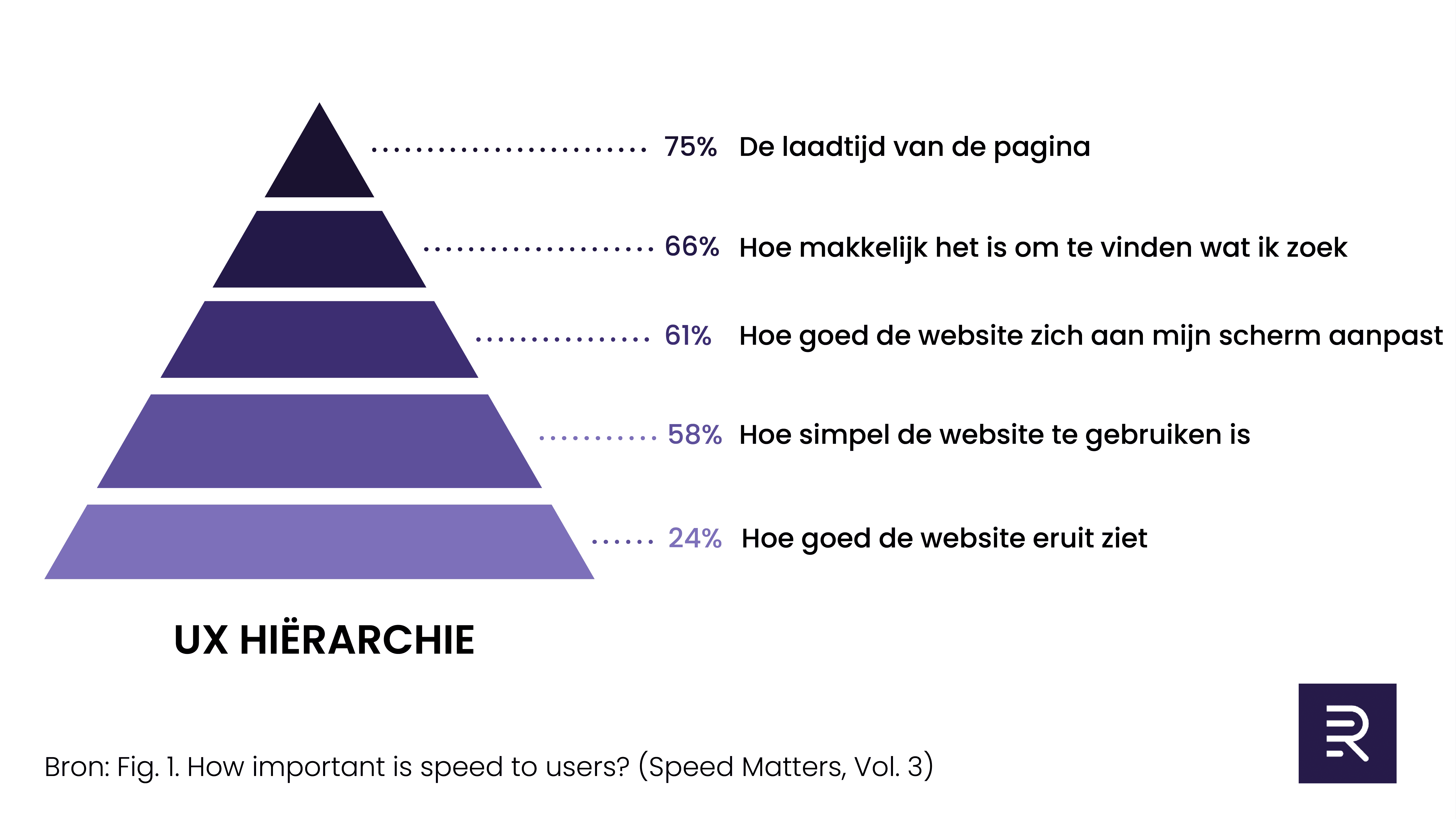 Wat blijkt namelijk uit onderzoek naar de gebruiksvriendelijkheid van websites? De snelheid van een website telt voor 75% mee bij de gebruikerservaring van bezoekers. Design is veel minder belangrijk. Dat laat deze piramide goed zien: